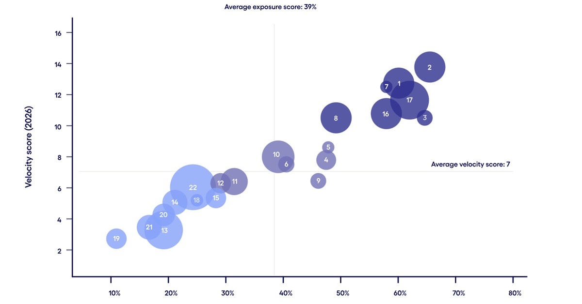 Cognizant 通过“暴露得分(Exposure Score)”和“速度得分(Velocity Score)”来衡量 AI 对不同职业的影响。研究发现,以下领域的变化最为剧烈: